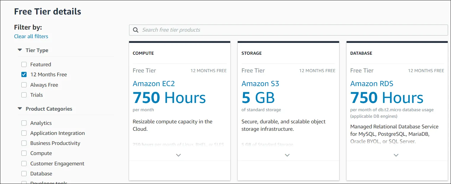 기간에 상관없이 Always Free로 제공되는 서비스들도 있지만 가입 후 12개월간 제공되는 Free-Tier 리소스로 많은 AWS의 핵심 서비스들을 체험하고 실습할 수 있습니다.