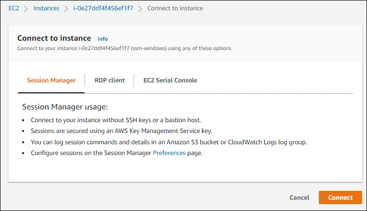 Session Manager Connect 버튼이 바로 활성화되지 않는 경우도 있습니다!