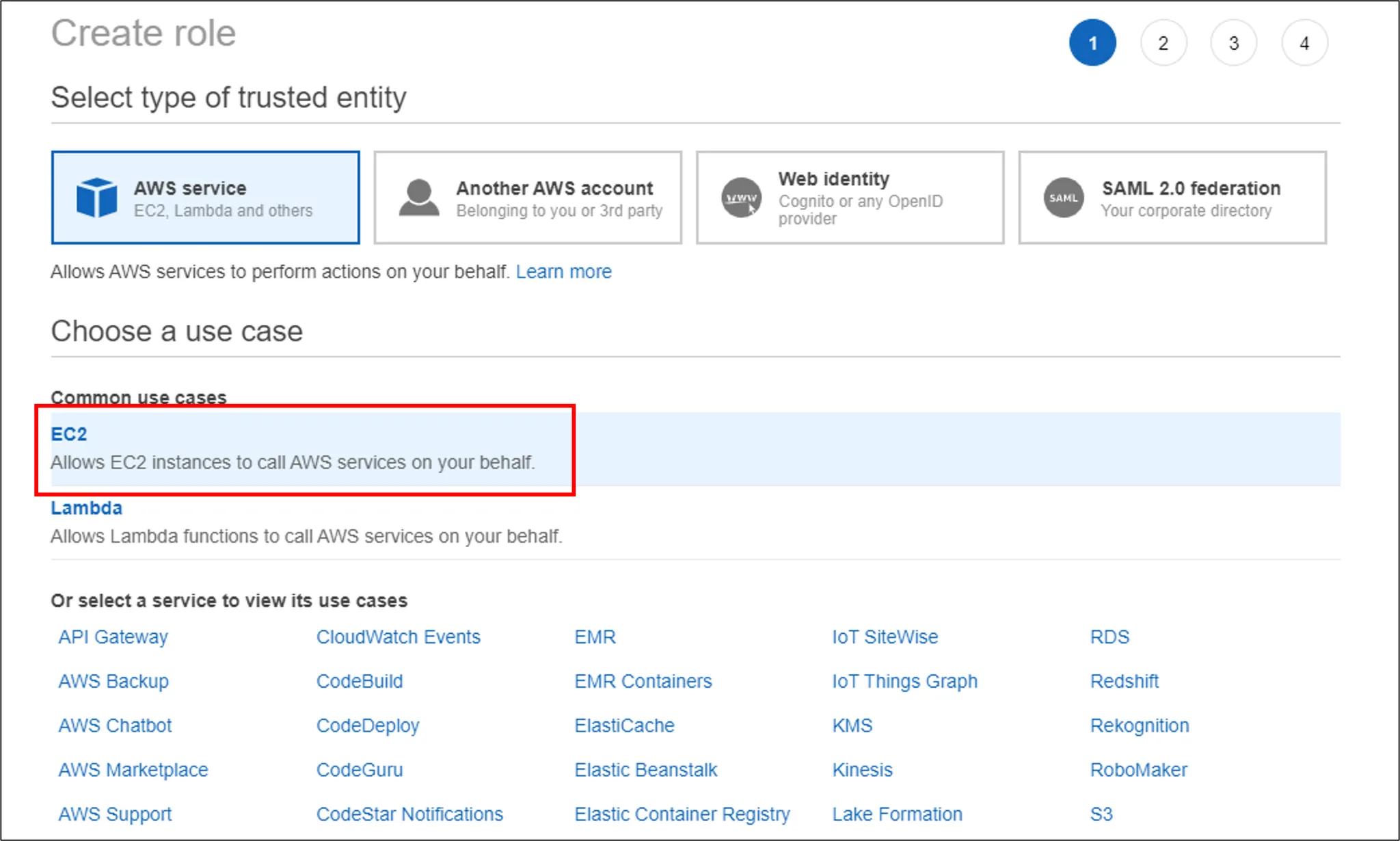 Use Case에서 EC2를 선택한 후, Next: Permissions 를 누릅니다