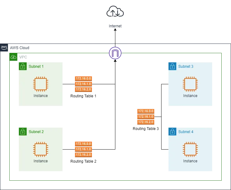 라우팅 테이블엔 0개 이상의 서브넷이 연결될 수 있으며, 서브넷은 최대 1개의 라우팅 테이블에만 연결할 수 있습니다. 라우팅 테이블 연결이 안 된 서브넷은 자동으로 생성된 default Routing Table에 비명시적으로 연결됩니다 (즉, 어떤 라우팅 테이블과도 명시적으로 연결되지 않은 서브넷은 기본 라우팅 테이블에 연결된 상태입니다)