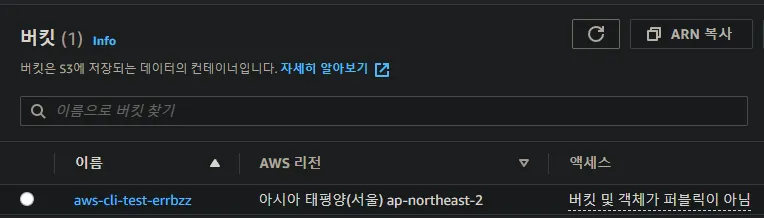 테스트를 위해 생성한 aws-cli-test-errbzz bucket을 AWS CLI로 조회하면 성공
